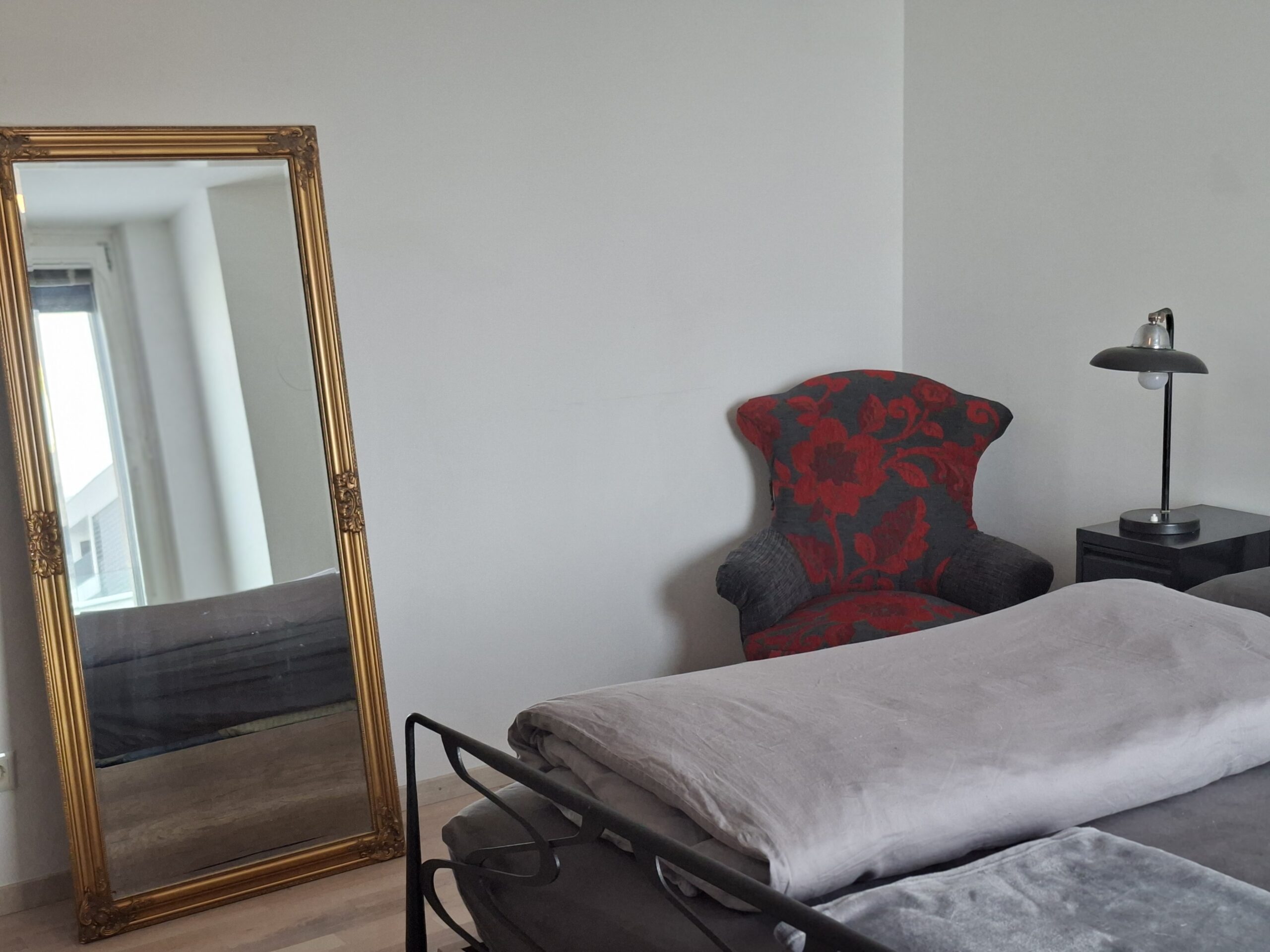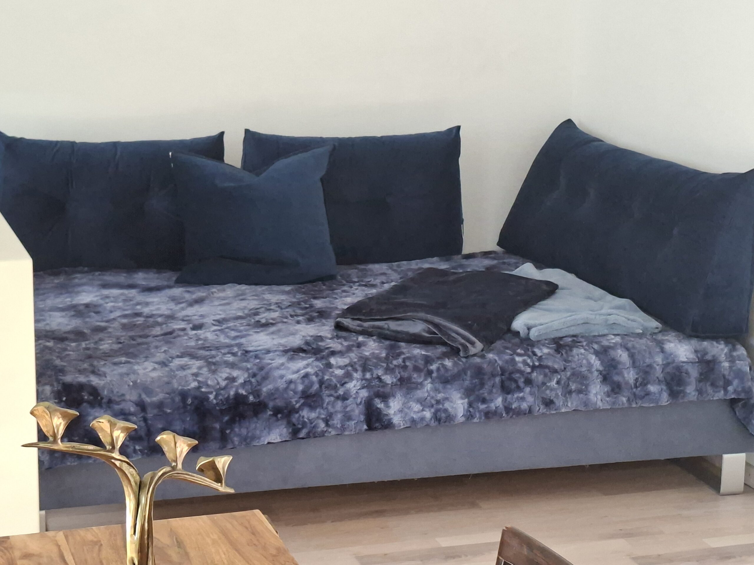 Es gibt auch die Möglichkeit ein Sofabett (blau, Marke Joka) günstig um 200 Euro und den Spiegelschrank im Bad um 100 Euro zu erwerben.